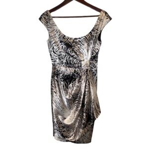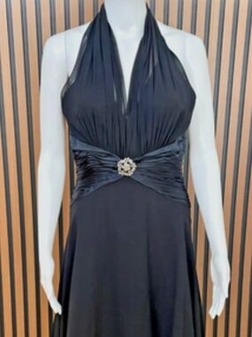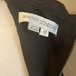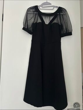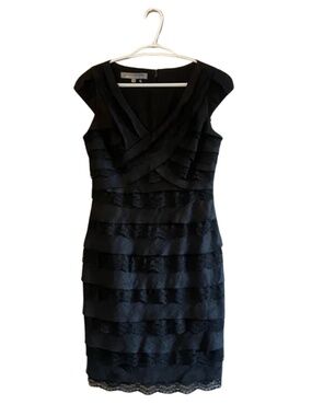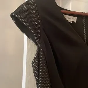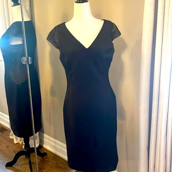 Black knit dress, fully lined with flattering side and cap sleeve in mesh fabric. Front V neck and exposed back zipper. Creates gorgeous hourglass shape.