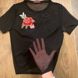 black mesh top with rose embroidery
