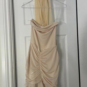 Worn once. Near perfect condition. Comes with both pieces (dress and mesh overlay) Designed with a boat neckline and a strapless internal structure beneath a soft mesh overlay, this dress radiates elegance and drama. The ruching detail at the waist enhances your figure, ensuring a flattering, comfortable fit. A playful mesh hem frill adds a touch of whimsy, while the lined bodice provides added comfort and support. With its mini length and captivating design, this dress is the perfect choice for formal events or special occasions, offering a balance of grace and confidence. Waist: 25-26 inches