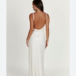 Stunning white sequin gown! It’s double lined so it’s not see through and has weight to it and drapes the body beautifully. It’s fully sequins and beaded.