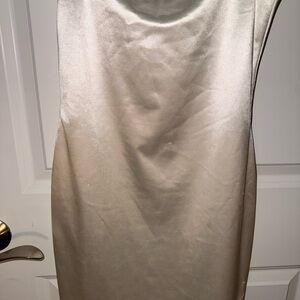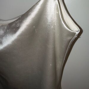 Chic white satin dress by Meshki. Features a sleek silhouette and rhinestone straps. The item has not been worn and still has its tags on, but because of being in storage for a long time, it has some light markings throughout see photos. Not really noticeable unless looking very closely under bright light.