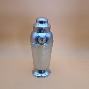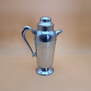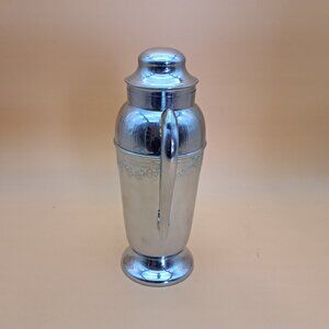 This is a vintage cocktail shaker decorated with a grape and leaf motif. The interior is almost pristine, the lid still comes off easily and the threaded cap works smoothly. As is usual with these there is a small ding, but one that is too small to appear in the pictures. Despite its look I doubt that it is silverplated. Larger than most that I've seen it stands 12" tall and is 4 1/4" at its widest without the handle.