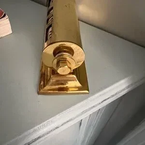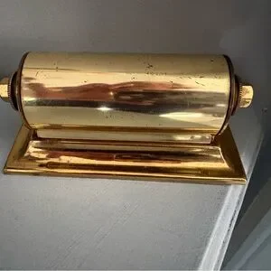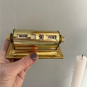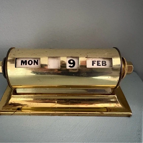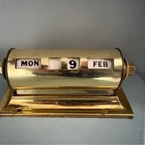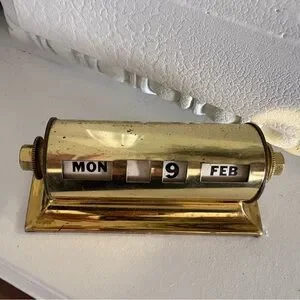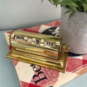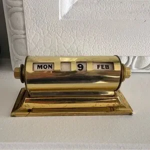 Vintage-style brass rotary perpetual desk calendar. Rotating day, date, and month display. Shiny gold-tone metal finish. Decorative and functional accent for desks or shelves. From the 1940s to the 1980s