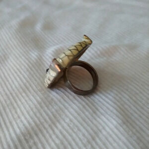 Cute painted metal ring. Nice as a pinkie ring or some one who has slim fingers. Pale yellow, brown, green with metallic lines and details. Very light shimmer on colours. Black eyes.