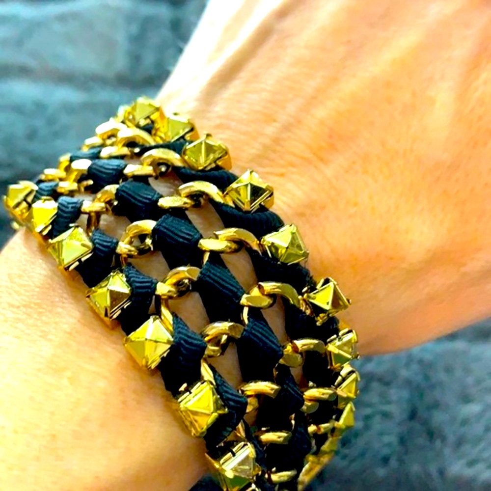 Black rope and yellow metal bracelet/cuff gorgeous showpiece super rockstar punk clock worn twice excellent Statement piece