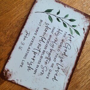 Metal wall art with verse from John 3:16. slight buckle on back of the picture but seems unnoticeable on front and still sits flat. New.