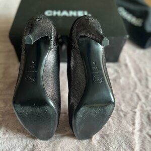 CHANEL Black and Silver Metallic boots. Size 38.5. Heels 4 inches or (12 cm) The boots run small, fit more like 7.5. Rounded toes, stiletto.