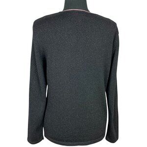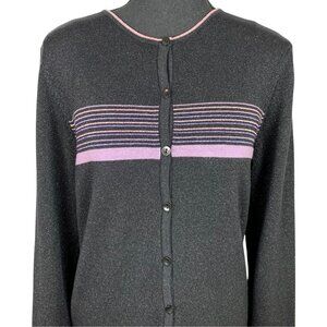 Metallic striped buttoned cardigan by Style & Co.. Crew neckline. Colors are metallic black, lilac purple and blush pink. 47% acrylic, 39% cotton, 9% polyester, 5% metallic. Made in Macau. Listed as a size S.