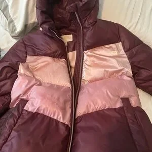Shiny metallic gold puffer jacket with a sleek design. Features a hood and front zipper pockets.