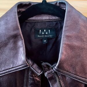 Edgy metallic leather jacket by designer David Meister. Beautiful copper finish with plum undertone. Genuine leather with acetate lining. Zipper up front, several pockets, snap closure at wrist. Excellent condition. High quality garment, originally retailed over $500. Women’s size ten, approximately 19” across chest.