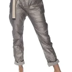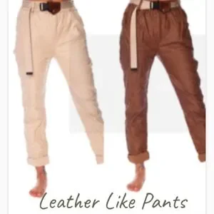 Elevate your wardrobe with the Leather Like Pant, featuring a sleek metallic leather-like fabric that adds a refined edge to any outfit. Designed with a comfortable pull-on jogger style and a stylish belt detail, these pants combine ease and elegance effortlessly. Practical pockets enhance functionality without compromising the sophisticated silhouette, making them perfect for both day and evening wear. Colors Gold & Beigh..