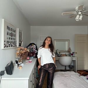 Stylish metallic pants paired with white top also for sale. Perfect for a chic look.