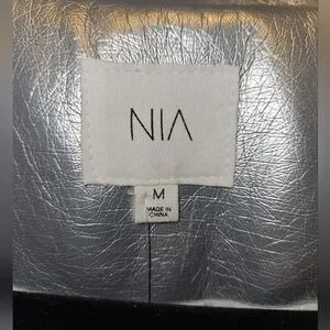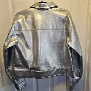 Fun metallic silver jacket with a structured collar and button-front closure. Perfect for spring!