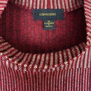 Metallic striped sleeveless turtleneck top by Espresso. Colors gold and red. 97% polyester, 3% spandex. Made in Mexico. Listed as a size M.