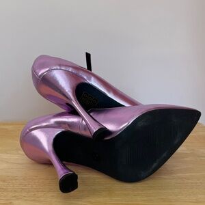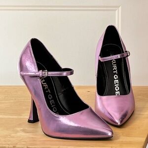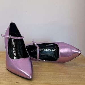 An eye-catching pair of high flair heels from the London brand KG Kurt Geiger, designed in a striking purplish pink metallic vegan leather.