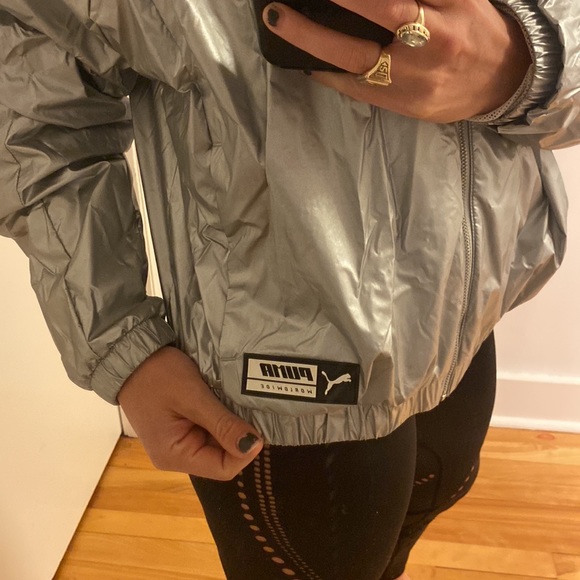 Silver metallic PUMA jacket. Purchased bigger size as it’s slightly cropped so this size fits a small at waist length. Mesh paneling interior super breathable.
