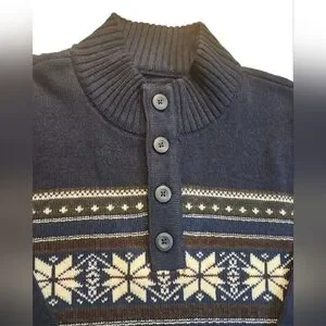 Classic navy sweater with a Nordic snowflake pattern across the chest. Features a ribbed mock neck and a four-button placket for easy layering. Soft knit construction for everyday comfort. Versatile navy color pairs well with jeans or chinos.