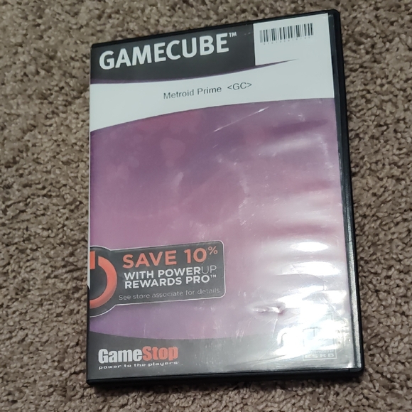 GameCube Metroid Prime game case in purple. Includes promotional sticker.