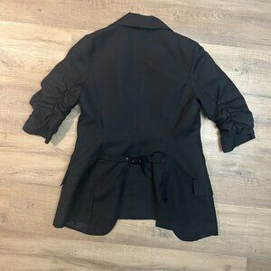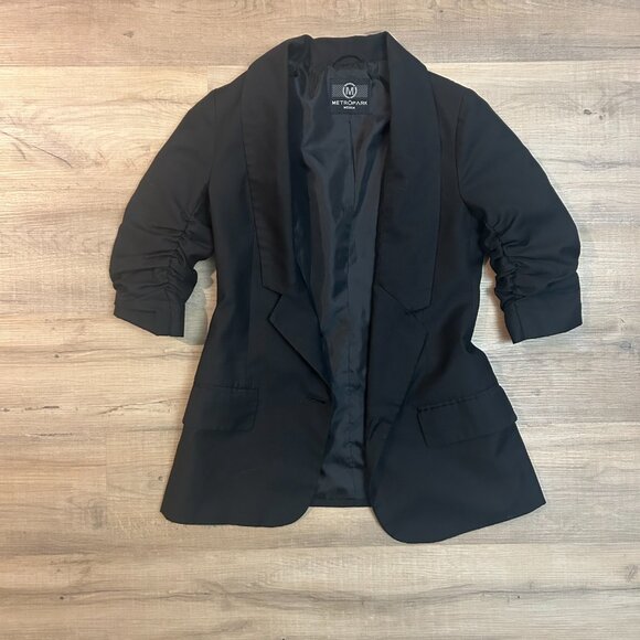 Metropark black blazer with ruched three-quarter sleeves, single button closure and belted back detail. Modern, versatile look that can be dressed up or down. Smooth, structured fabric and fully lined.