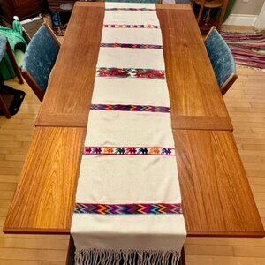 Colourful Mexican table runner from Oaxaca. Off white with multicoloured roosters, zig zags, and flowers, all hand stitched. To be more specific I think it seems to be from the area of Huautla de Jimenez, a town in the very north of Oaxaca. Two small grey marks the size of my pinky nail as shown in last photo. Measures 73 inches long (about 6 feet) without the tassels. Cat friendly, nonsmoking home.
