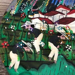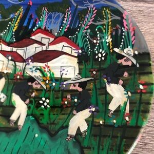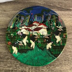 This beautifully handcrafted decorative plate features a vibrant village scene. The intricate design showcases a blend of green, blue, and red hues, bringing a touch of artistic elegance to your home decor. Hand made clay plate with hand painted design.