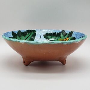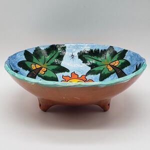 Mexican Hand Painted Folk Art Storyteller Sun, Trees & Fish 3 Footed Bowl - 2012. EUC with no signs of chips, cracks, scratches or crazing. Approx. size: 9.75" (w) x 9.75" (l) x 3.5" (h). Gorgeous hand painted Mexican clay bowl with bright and bold colours. This beautiful bowl depicts a scene of the hot sun shining down on the light brown sand with 2 palm trees on either side and 2 colourful fish swimming under the surface of the ocean waters. It is signed "2012" and is a wonderful Mexican folk art display piece as a console bowl or centrepiece, perfect for any office or home. !!!DO NOT USE WITH FOOD!!! **NOT RECOMMENDED FOR FOOD** - !!!NOT FOOD SAFE!!! - !!DISPLAY PURPOSES ONLY!!