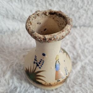 Unique Mexican clay pottery vase features hand painted villager walking with a water pot atop her head along a path with shrubs and bushes.