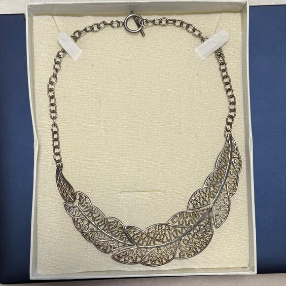 This is a Mexican Sterling Silver, handcrafted, leaf shaped necklace. Length is 45 cm; Weight 87g. The Leaf width is 30mm. Wears beautifully and it is a very elegant piece. Retails for CAD1,100.