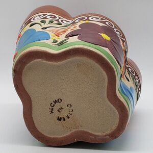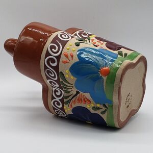 EUC with some age-appropriate chipping on the top edges which do not impede the look or function of this beautiful piece. Approx. size: 6" (w) x 8" (l) x 9.75" (h). A wonderful unique way to hold all your cooking or baking utensils. The gorgeous array of blue and purple flowers and the colourful accents of scrolls and leaves on top of natural earthenware clay give this piece a wonderful rustic look. The array of bright and bold colours make this Mexican art pottery piece pop! You can even use this to display your fresh cut flowers in a lovely and unique way. A beautiful and practical Mexican art pottery work of art! Bottom is marked "Hecho en Mexico" translated means "Made in Mexico".