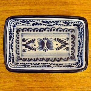 Mexican Talavera pottery small tray and two tequila glasses with handles, blue pattern and handmade in Puebla, Mexico by Salazar Talavera. Excellent used condition. Glasses circumference is around 1.75 inches, height is just under 3.5 inches. Tray measures 7.75 inches long and 6.25 inches across. Cat friendly, nonsmoking home.