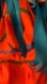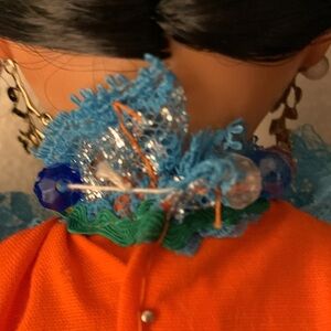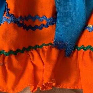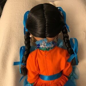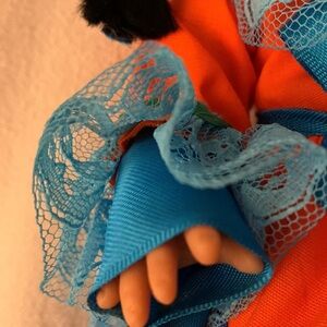 She has a hard plastic body with a vinyl face. She measures. The outer garment is a orange dress with blue and green trim crisscrossing the skirt and a gathered ruffle at the bottom with a lace neckline and cuffs. Ribbon tie at the waist and in her hair