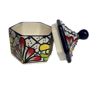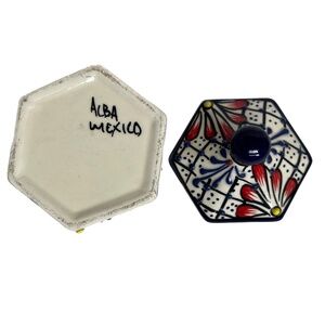 Mexican Trinket Box Art Pottery Lidded Ceramic Alba Mexico Floral 3D Blue Yellow