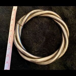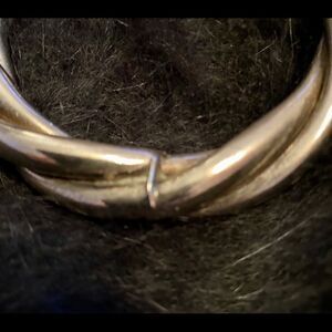 Just a nice, clean lined silver bracelet. There’s a little bit of wear, as you can see in the pictures, but you don’t see that outside of the photos. This really goes with everything. I am selling a silver braided ring, as well, if you’re interested in a matching set. This bracelet is not stamped.