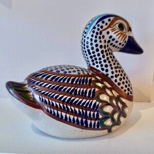 Mexican vintage (2005) Tonala duck, handmade and handpainted. In excellent vintage condition. A mix of taupe, brown, cream, navy, green, and sky blue. Measures approx 6.5 inches tall, 7.5 inches long, and 4.75 inches at its widest point. Cat friendly, nonsmoking home.