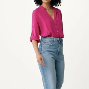 A button up blouse with rolled sleeves, band collar, and centre box pleat. Wide fit with long sleeves. Some piling and a snag on the left shoulder that is visible from the front (see photos).