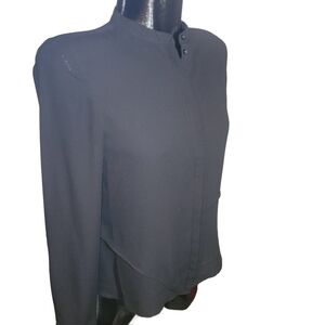 Mexx metropolitan black blouse with button front and button placket. Mandarin style collar and asymmetrical cut overlay in front.