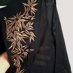 Beautiful botanical-themed embroidery along the long V opening in golden thread
