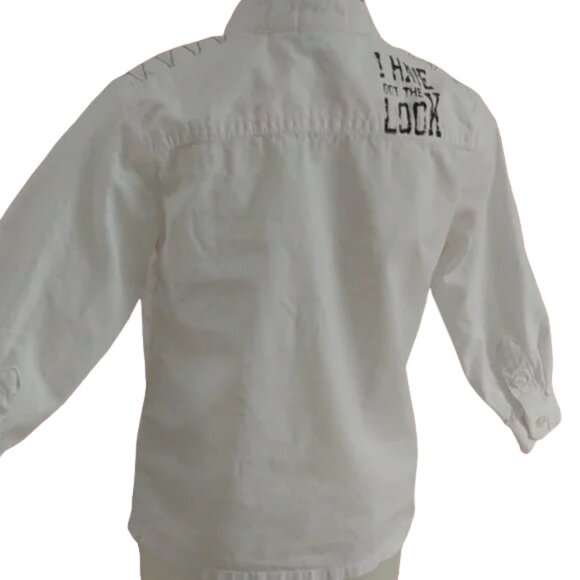 This is a stylish white button-front, long-sleeved, collarless shirt by Mexx. It has triangular stitch details on the shoulders and zigzag stitching along the button front. On the left side, there is a single flap chest pocket. The unique distressed style print on the back shoulder that boldly states "I have got the look" adds a touch of individuality and flair to this shirt. This makes it a confident statement message. It is a classic and versatile piece that could be dressed up or down and is in very good condition with no stains or holes.