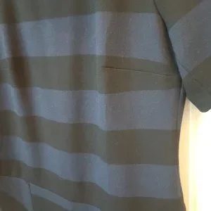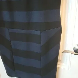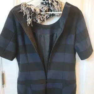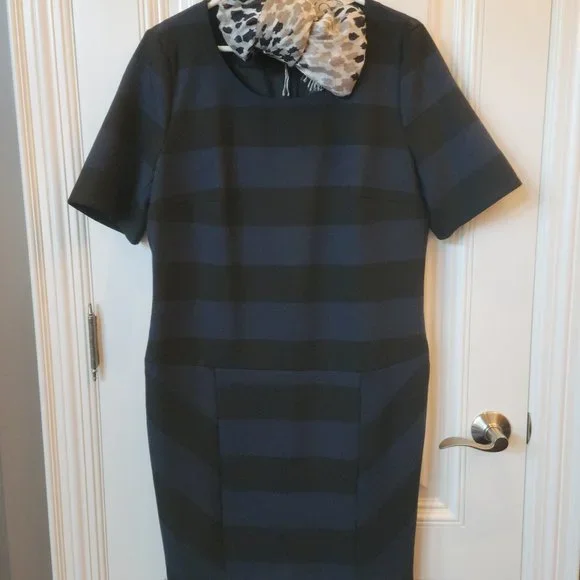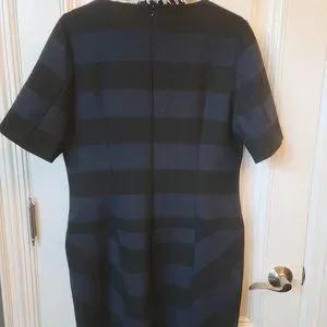 Mexx Metropolitan, EUC, Size 14, fully lined, navy and black, horizontal striped short sleeve dress. Great drape on this dress with structure, weight, perfect for colder Temps. Long concealed back zip. 65% polyester, 30% viscose, 5% elastene.