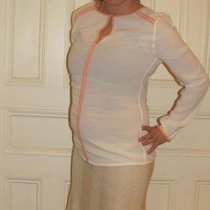 Wonderful elegant crepe blouse that can light up a room. The pink trim gives it added dimension. If in Canada I would list it as a medium. The label says 2 US or 32 CA