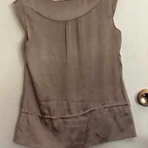 Very pretty sleeveless top with detailed smocking and tux like details. Beautiful top. It has waist tie built in. Silk looking fabric.