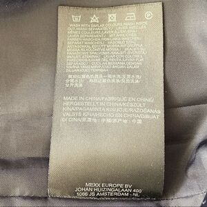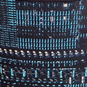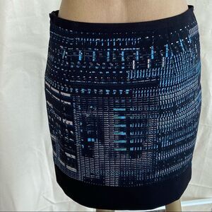 Polyester spandex, abstract print. 6.5” side zipper, lined, blue trim detail on front hem, EUC, waist 26”, hip 17”, length 17”