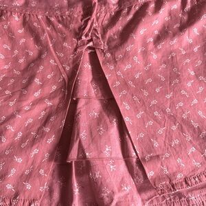 It has adjustable spagetti straps, a pink/white floral print, and a back with corset lacing a V and an underskirt.