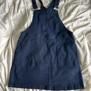 Stylish navy blue denim overall dress with adjustable straps. Features front pockets for convenience. This item is free from rips and stains! It has only been worn a handful of times and is ready for its new life in your closet!! Comes from a smoke free home, washed on delicate and dried on low.
