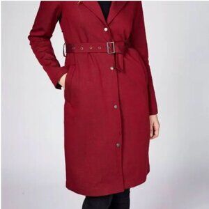 100% Cotton with polyester lining. Snap front with belt. Has pockets and and detachable hood. Gently pre-loved; excellent condition. Undamaged. I wore it about 6 times and ALWAYS got compliments on it. It unfortunately no longer fits me.