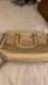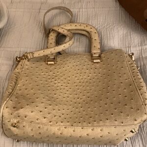 This auction is for a very nice looking tan faux ostrich shoulder bag that is Miadora brand. Purse is very roomy and The two compartments on the inside are pretty big and One side has a zipper pocket and the other has two divided pockets and then there is a smaller zipper pocket in the middle. The closure on this is a zipper at the top but snap on the side. Bag measures 8.5" high x 6" wide X 14" long. The accents on this are gold with faux leather ostrich handles. The bottom has 4 nubs on it.
