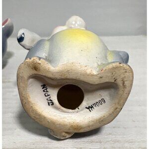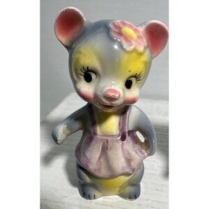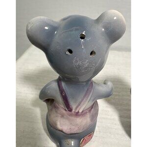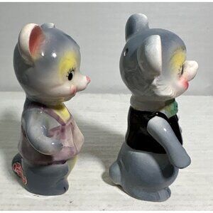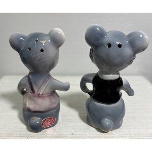These mid-century ceramic mouse shakers feature hand-painted details and charming outfits - one in a pink dress with flower accent, the other in a black vest with green bowtie. Made in Japan with classic anthropomorphic styling typical of 1950s kitchenware.