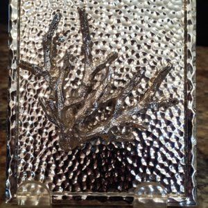 Beautiful Michael Aram Coral Reef piece that would be beautiful set in a shadow box or sit on a stand as I have done. My initial intention was to set this in a shadow box. It measures 5" x 4 1/8" x 1 1/2" . I believe this was a jewel box lid, but no longer in circuit. His work is sought out world wide and absolutely beautiful. This has a silver stamped signature on back. This little sculpted Reef piece has big impact!