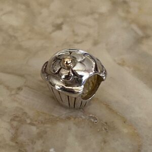 In excellent preowned condition lovely Michael Hill cupcake charm bead in 10K yellow gold and sterling silver. This bead is compatible with to Pandora.