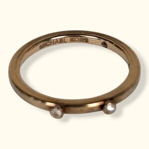 This ring by Michael Kors is made of a gold tone metal and is a thin, stackable band. There are 2 white/clear stones on the front which are raised, not flush with the band. If they are like those in every other Michael Kors ring, are made of cubic zirconia. The interior of the band says MICHAEL KORS as well as "8". The 8 should indicate size, but measures differently for me. There is also a round little dip that has the appearance of a recessed stone. The ring has normal wear and looks great by itself or as part of a stack.